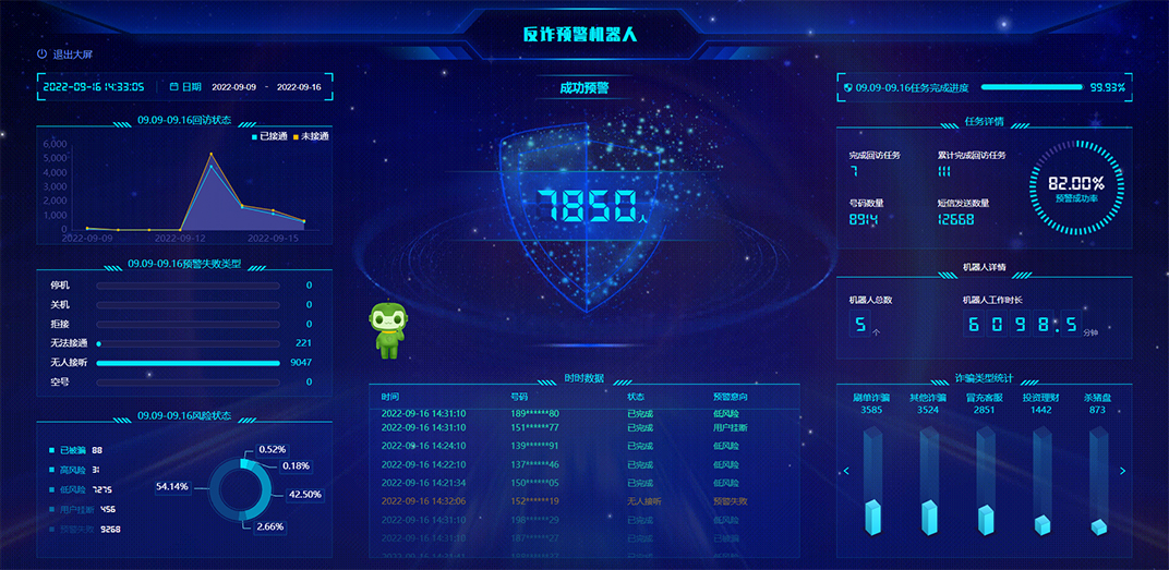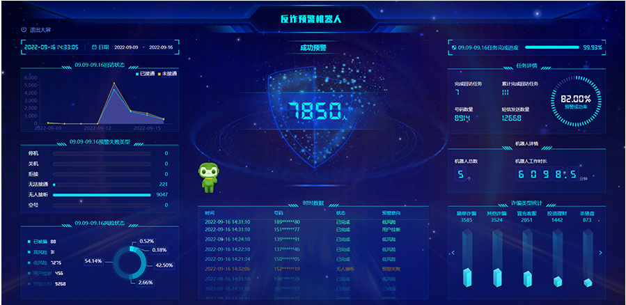 反詐預(yù)警機器人可以匯總重要數(shù)據(jù)進行大屏展示,方便反欺詐中心警務(wù)人員實時進行監(jiān)控管理,主要包括勸阻成功人數(shù)、任務(wù)狀態(tài)、回訪意向、通話情況、線路狀況、實時回訪數(shù)據(jù)、詐騙類型等。