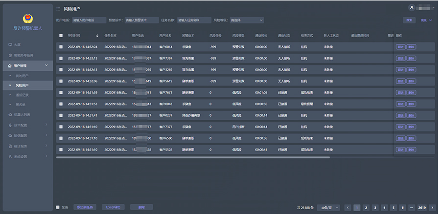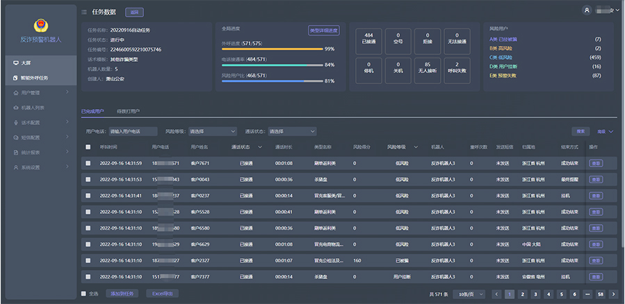 反詐預(yù)警機器人可統(tǒng)一管理外呼預(yù)警勸阻任務(wù),提供批量導(dǎo)入高風(fēng)險人群,對機器人工作時間進行靈活配置并執(zhí)行任務(wù),全量撥打可疑被詐騙電話。反詐預(yù)警機器人每日可外呼的預(yù)警勸阻電話在800~1000 通/線路·天左右(可根據(jù)呼出需求量增加呼出線路數(shù)),即每日可完成原來5~10 人的預(yù)警勸阻工作,通過智能海量外呼,并以圖表形式直觀展示任務(wù)執(zhí)行情況,100%完成外呼預(yù)警勸阻任務(wù),大幅度提升工作效率。
