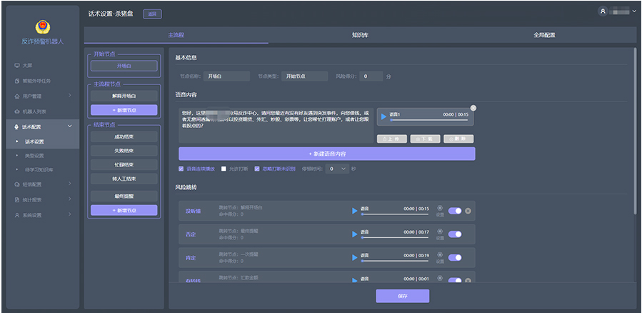 警務(wù)人員可以根據(jù)業(yè)務(wù)流程,自行配置話術(shù)。話術(shù)配置方式可視化,支持 TTS 語音播報,話術(shù)全局化、流程化、節(jié)點化相結(jié)合,話術(shù)內(nèi)容自由跳轉(zhuǎn)等功能。話術(shù)設(shè)置過程中,支持新建及導(dǎo)入話術(shù)模板,可編輯意向及對應(yīng)分值;在話術(shù)詳情中,可配置主流程、知識庫及多輪對話等內(nèi)容。支持利用小程序上傳真人錄音。