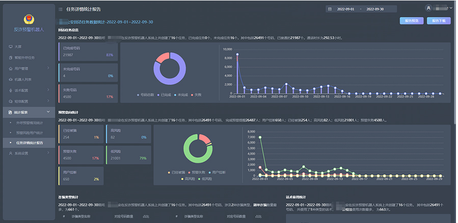 系統(tǒng)可提供溝通情況統(tǒng)計、客戶分類評判情況統(tǒng)計(已經(jīng)受騙、高風(fēng)險、預(yù)警失敗、低風(fēng)險、用戶掛斷等)、外呼失敗情況統(tǒng)計報表,并可結(jié)合個性化需求,對多種數(shù)據(jù)維度進行統(tǒng)計并圖表展示。